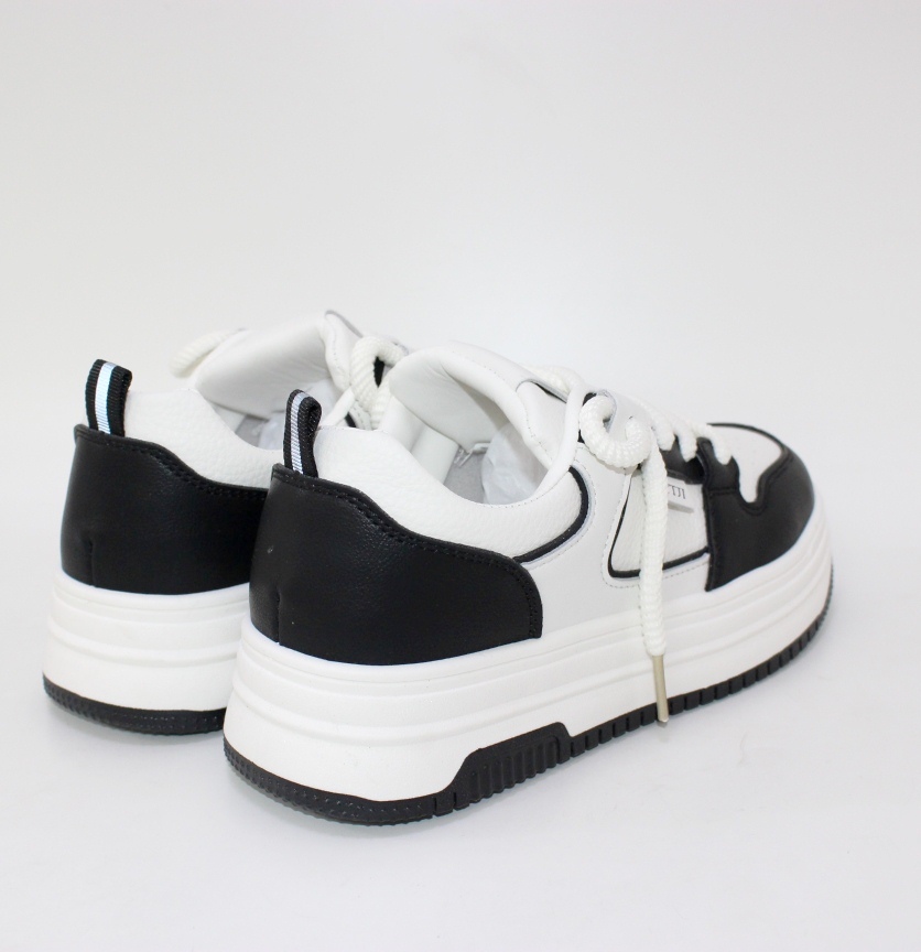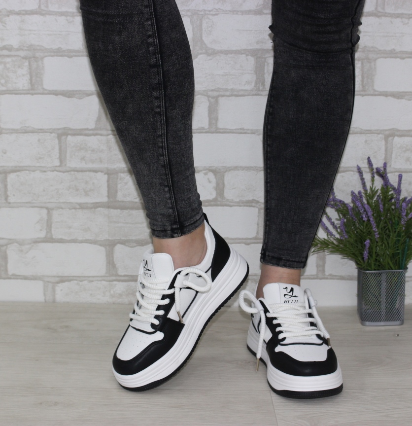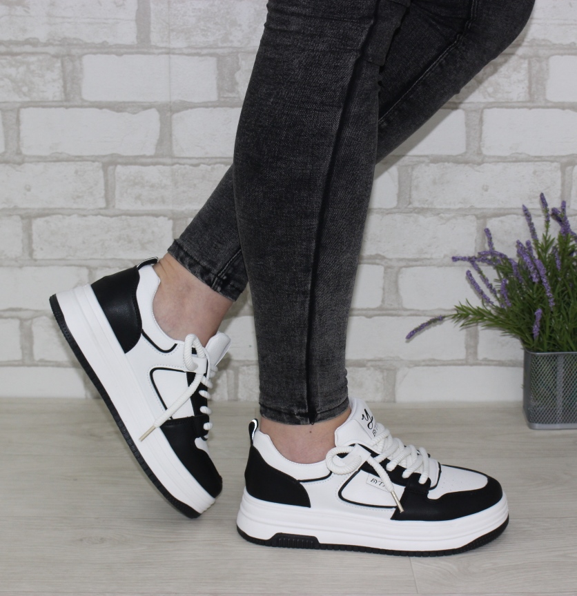 Круті чорно-білі жіночі кросівки на плоскій підошві.